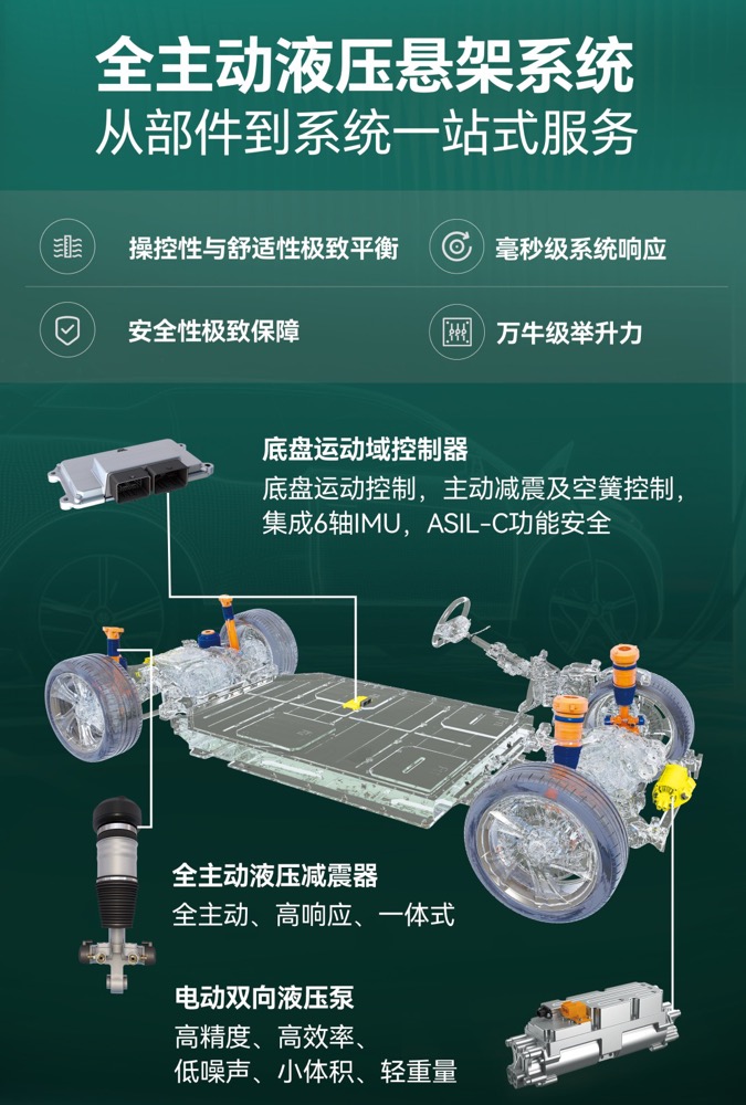 麦米电气旗下安衡迅推出智能全主动液压悬架系统,可以实时监测道路状况和车辆姿态变化,并通过四个独立的液压单元快速给每个车轮悬架提供驱动力,自动快速调节车辆姿态,全面提升车辆的安全、舒适和操控性能。