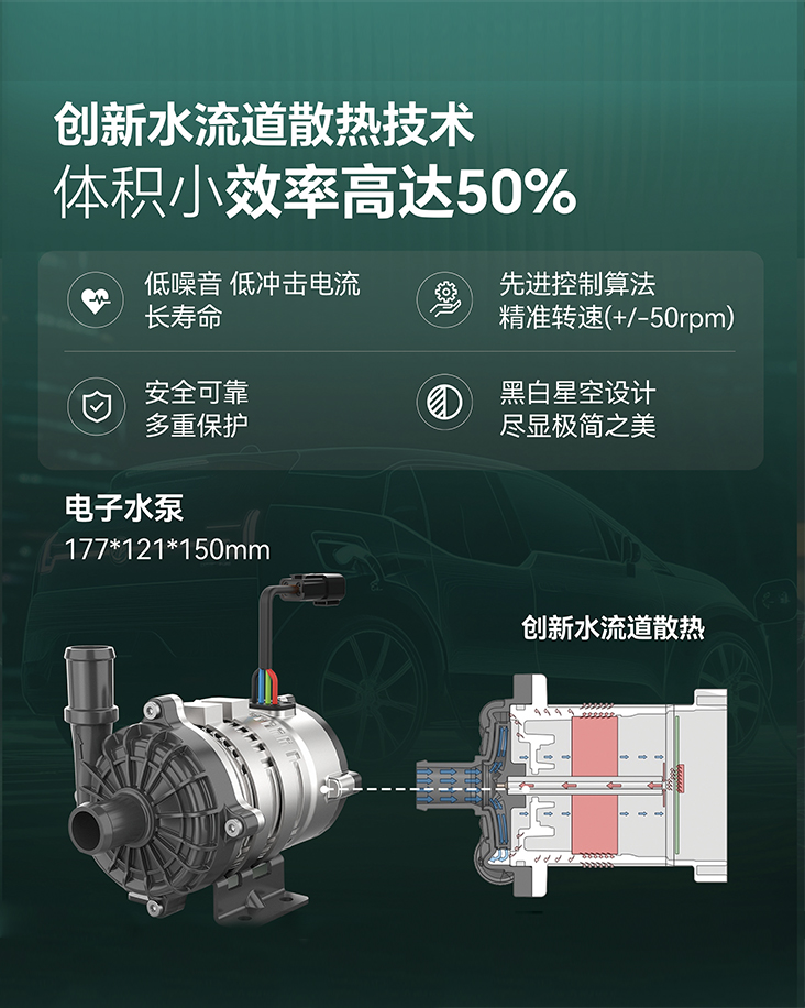 PMV300系列电子水泵革新升级,重量和体积均减少近15%,且效率高达50%。还有多款支持高电压(600V, 800V)的电子水泵。