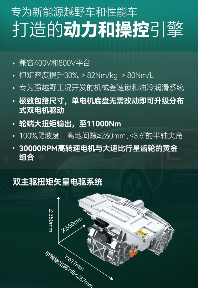 分布式双主驱系统专为硬派越野和性能车辆开发,轮端大扭矩可至11000Nm,轻松应对强越野工况和提升动态越野性能。相同底盘车架可无缝切换单电机驱动和双电机分布式驱动产品,帮助客户获得XYZ三个方向最佳的空间收益。
