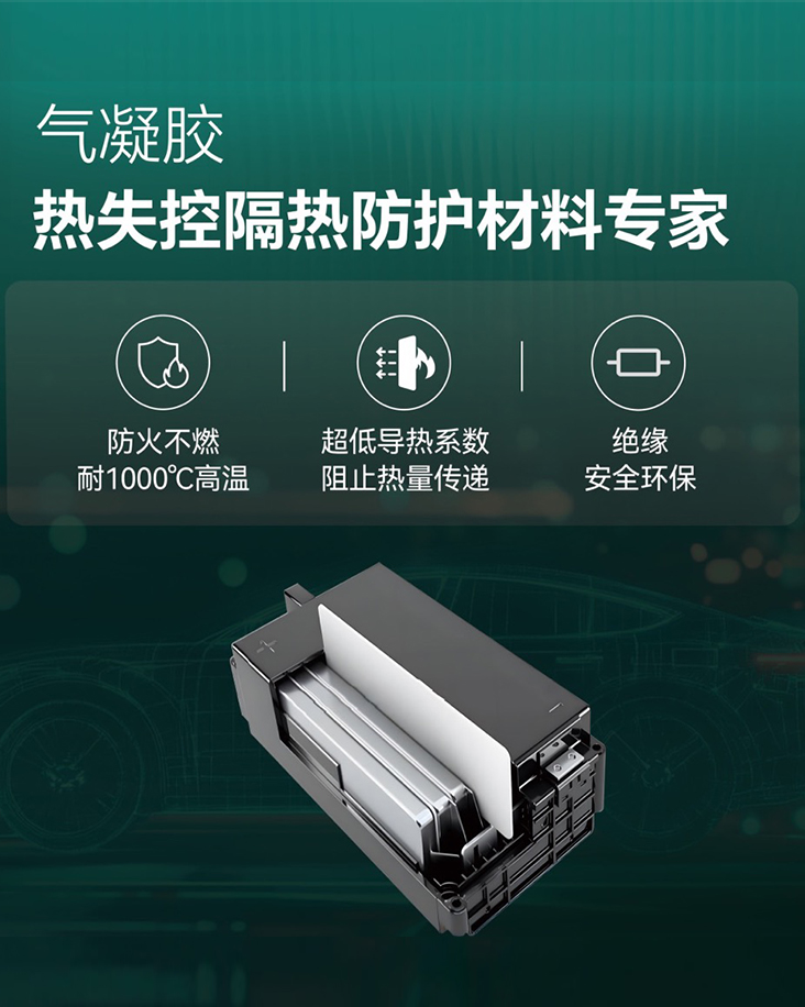气凝胶材料具有超低导热系数,嵌于电池电芯之间,在电池正常工作时,起到缓冲作用,在电池热失控时,有效防止火焰蔓延、减缓热量传递,确保相邻电芯不受影响,抑制热失控的发生。